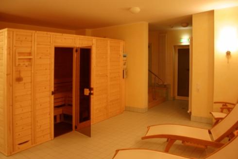 eingerichteter Wellnessbereich mit Sauna, Tretbecken und